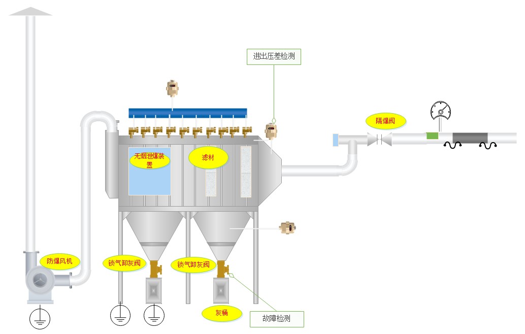 粉體防爆泄壓產(chǎn)品主要有泄爆片、無焰泄爆裝置、隔爆閥、火花探測及熄滅裝置等。另外風(fēng)壓差檢測報(bào)警裝置也是對除塵器的性能進(jìn)行有效預(yù)防的一個(gè)重要手段。