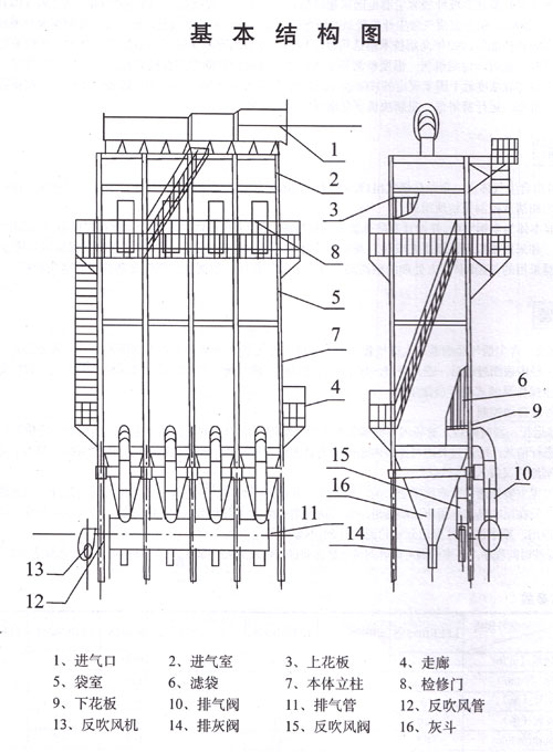 玻纖袋式除塵器的進(jìn)氣、排氣及反吹系統(tǒng):包括進(jìn)氣管道、進(jìn)氣室、反吹閥、反吹風(fēng)管、三通管、排氣閥、排氣管。